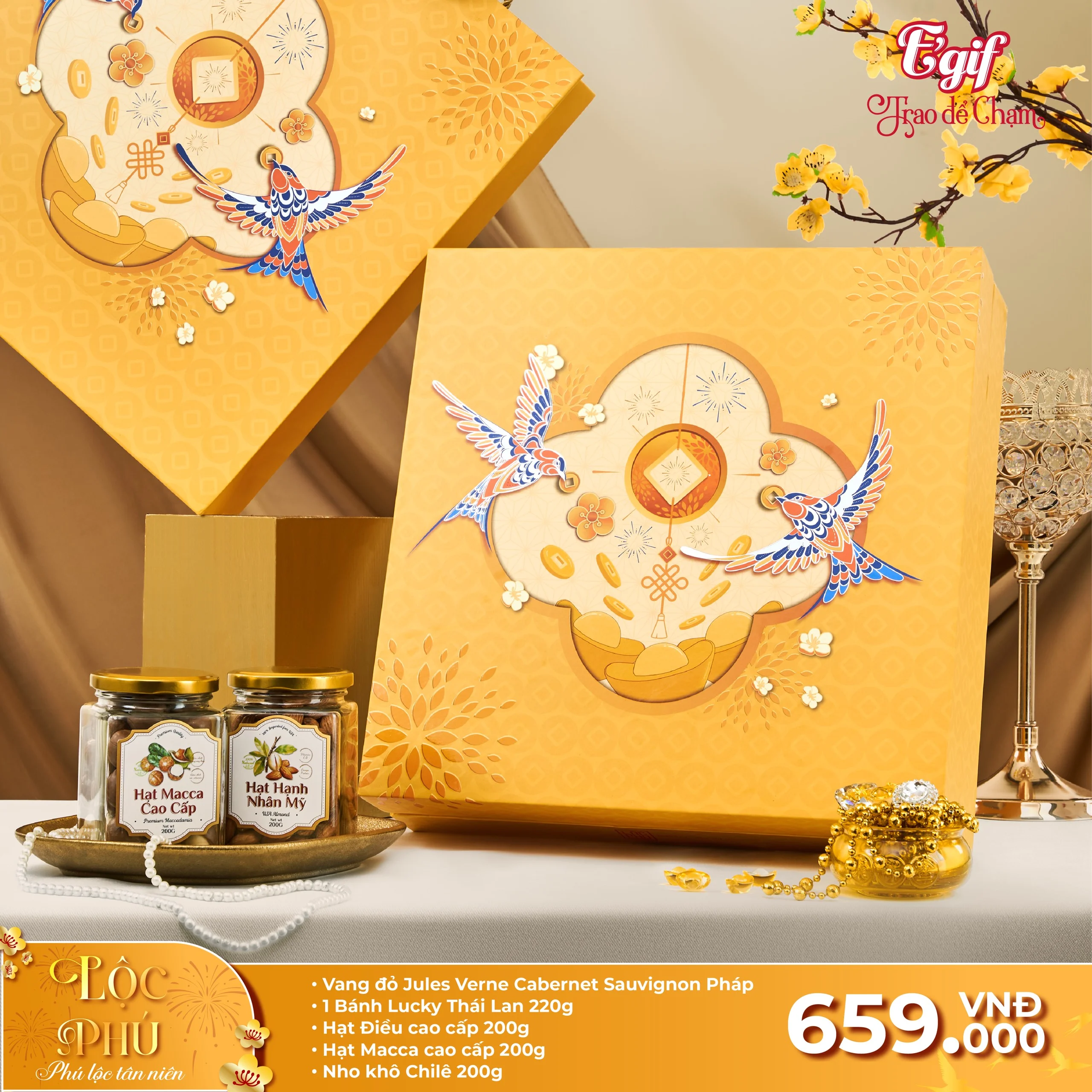 Tài lộc, thịnh vượng là lời chúc được dành cho nhau nhiều nhất trong dịp Tết Nguyên đán, vì thế các hộp quà Tết với hình ảnh có ý nghĩa biểu tượng về sự giàu có, phát đạt như đồng xu, thỏi vàng, mèo thần tài, tỳ hưu, thiềm thừ,… Các món quà Tết mang lời chúc tài lộc được ưa chuộng bởi ý nghĩa tài lộc, lời chúc thịnh vượng nó mang đến phù hợp để dành tặng nhiều đối tượng, đặc biệt là đối tác, khách hàng, bạn làm ăn,…